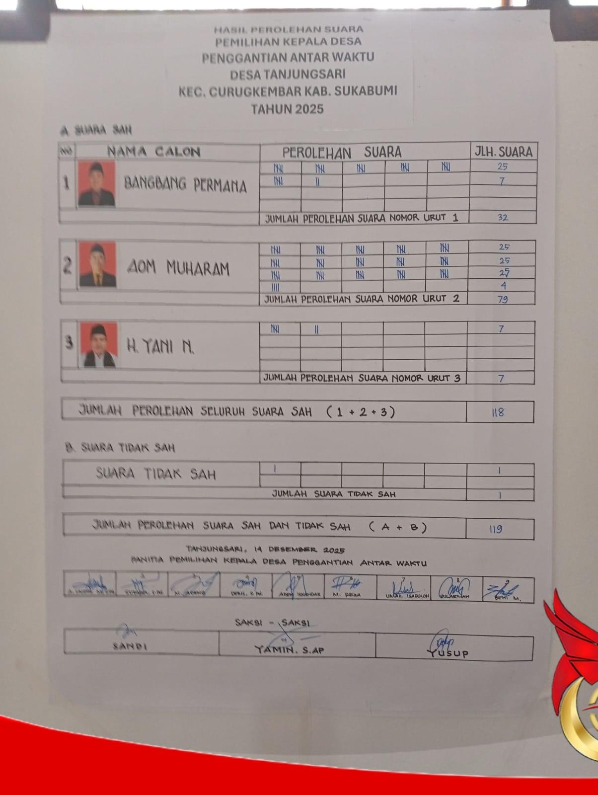 CAKRAWALAJAMPANG – Pemilihan Kepala Desa Pergantian Antar Waktu (PAW) Desa Tanjungsari, Kecamatan Curugkembar, Kabupaten Sukabumi, berlangsung lancar dan kondusif pada Minggu (14/12/2025). Dari hasil pemungutan suara, Aom Muharam berhasil meraih kemenangan dengan perolehan suara terbanyak.