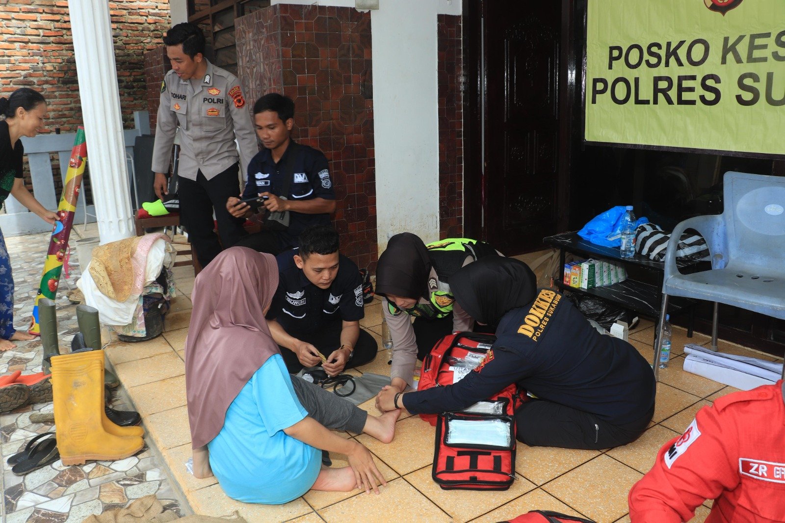 Kegiatan kemanusiaan ini dipimpin oleh Kasi Dokkes Polres Sukabumi, Aiptu Fahmi Yusa, atas perintah Kapolres Sukabumi, AKBP Dr. Samian, S.H., S.I.K., M.Si. Tim Dokkes memberikan pemeriksaan kesehatan, pengobatan ringan, serta bantuan medis kepada warga yang mengalami keluhan akibat banjir.