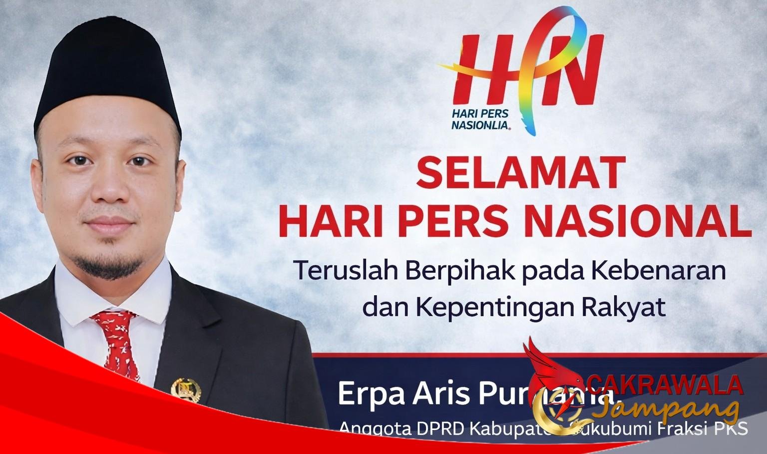 CAKRAWALAJAMPANG – Anggota DPRD Kabupaten Sukabumi dari Fraksi Partai Keadilan Sejahtera (PKS), Erpa Aris Purnama, menyampaikan ucapan Selamat Hari Pers Nasional (HPN) kepada seluruh insan pers di Indonesia. Ia menilai pers memiliki peran strategis dalam menjaga demokrasi serta menyuarakan kepentingan masyarakat.