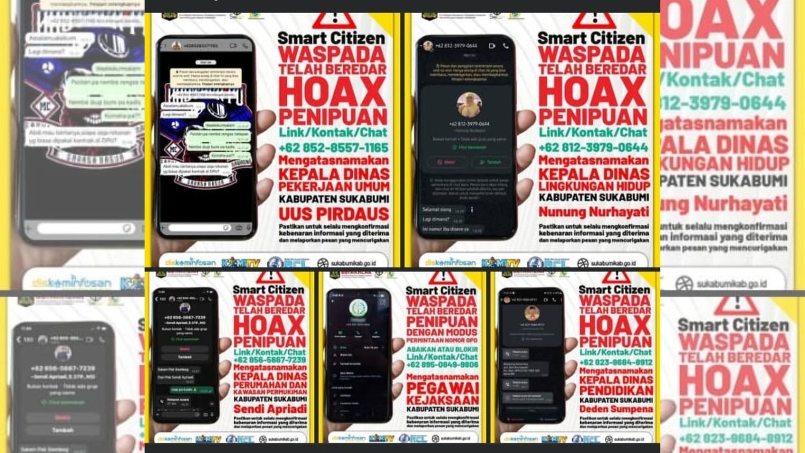 Dalam unggahan Instagram resmi @pemkab_sukabumi_diskominfo, menyebutkan harap berhati – hati jika dihubungi nomer tersebut melalui WhatsApp, telepon atau SMS yg mengatasnamakan Kepala Dinas Pekerjaan Umum, Kadis Perkim, Kadis DLH, Kadis Pendidikan, dan pegawai Kejaksaan Kabupaten Sukabumi. Karena nomer nomor tersebut diduga digunakan untuk modus penipuan.