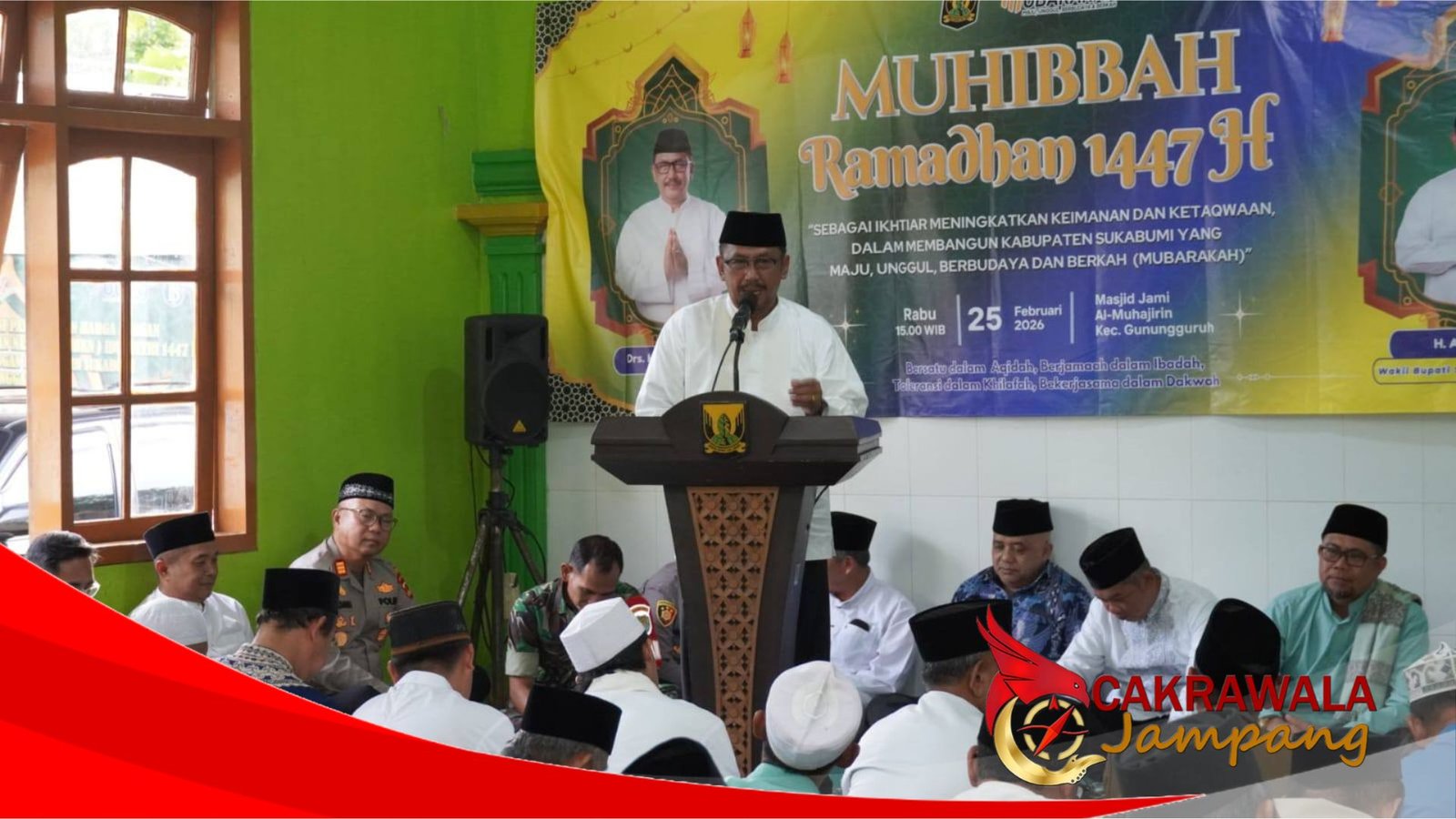 CAKRAWALAJAMPANG – Bupati Sukabumi H. Asep Japar bersama Wakil Bupati H. Andreas menghadiri Muhibah Ramadan Tingkat Kabupaten Sukabumi di Masjid Jami Al-Muhajirin, Kampung Ciburial, Desa Gunungguruh, Kecamatan Gunungguruh, Rabu (25/2/2026).
