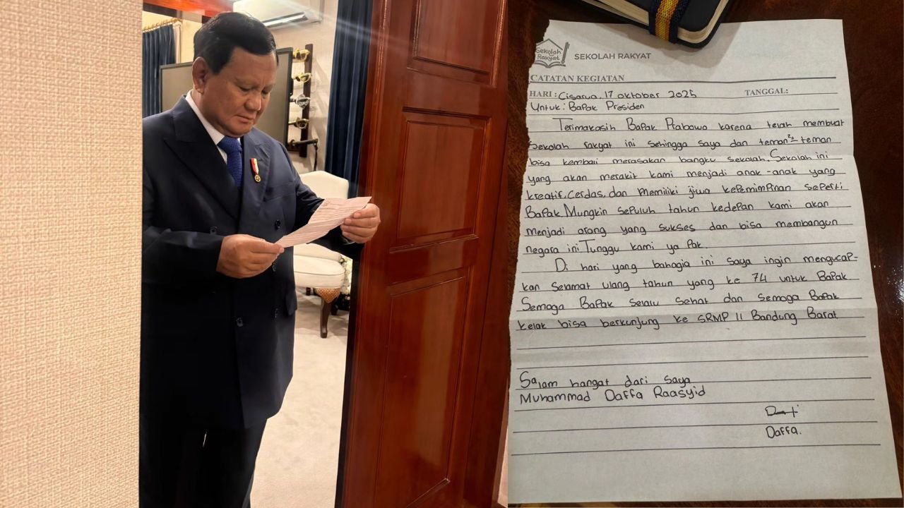 Dalam surat yang sama, Daffa juga mengucapkan selamat ulang tahun ke-74 kepada Presiden Prabowo, seraya mendoakan agar beliau senantiasa diberi kesehatan dan suatu saat dapat berkunjung ke sekolah mereka di Bandung Barat.