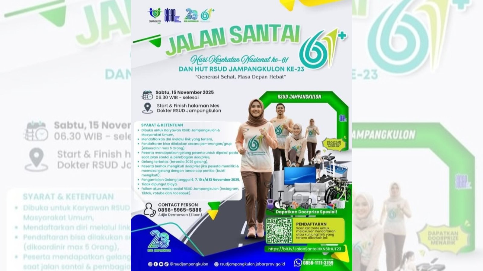 CAKRAWALAJAMPANG – Dalam rangka memperingati Hari Kesehatan Nasional (HKN) ke-61 sekaligus Hari Ulang Tahun ke-23, Rumah Sakit Umum Daerah (RSUD) Jampangkulon, Kabupaten Sukabumi, akan menggelar kegiatan Jalan Santai “Sehat Bareng, Menang Hadiah” pada Sabtu, 15 November 2025.